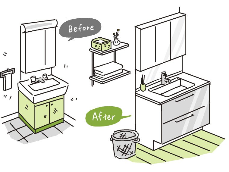 洗面化粧台を交換するシンプルなリフォームですが、洗面化粧台が進化しているので交換するだけでも洗面所の使い勝手はアップ!スライド式のキャビネットにすることでこれまで無駄になっていた排水管付近のスペースが有効活用できたり、継ぎ目のない一体型のボウルにすることでお掃除がらくになりますよ。レバーに触れずに自動吐水する水栓や、除菌水が出る最新の機能もあります。