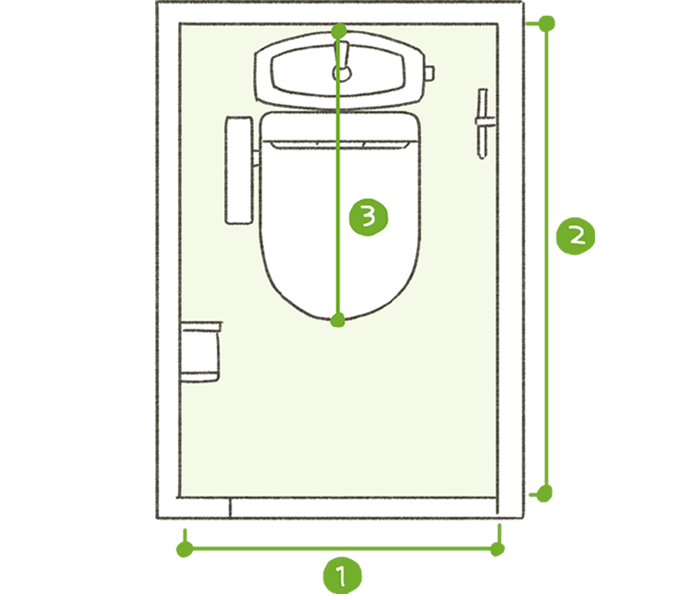 ※❶~❸を測ると便器前の寸法がわかります。便器前の寸法は、身づくろいするために40cm程度必要です。