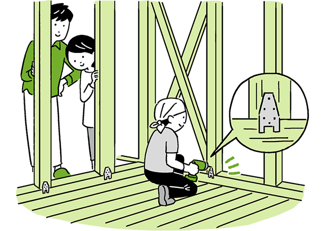 地震の衝撃とエネルギーを吸収し、建物に揺れが伝わらないようにする工法。建物と地面の間に「免震装置」を設置します。屋内の揺れを最小限に抑えられるため、タンスや本棚、冷蔵庫といった大きな家具・家電の転倒による怪我を防止することにもつながります。 | 建物に「粘り」をもたせることで、上階の振動を抑える工法。2階建て以上の建物の1階の壁に制震具を取りつけます。制震具が建物内に伝わる地震エネルギーを吸収するため、基礎や土台は揺れますが、2階以上の階の振動は抑えることが可能。梁や柱への負担が少ないのも特長です。 | 建物の骨組みの強度を増し、頑丈にすることで倒壊を防ぐ工法。筋交いや金具などを使って壁・床・屋根、土台と柱、柱と梁といった接合部分を補強します。 |