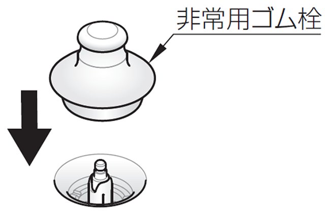 排水栓を真上に引き抜いて外した後、非常用ゴム栓を排水口に真っすぐ入れる。