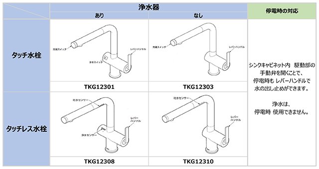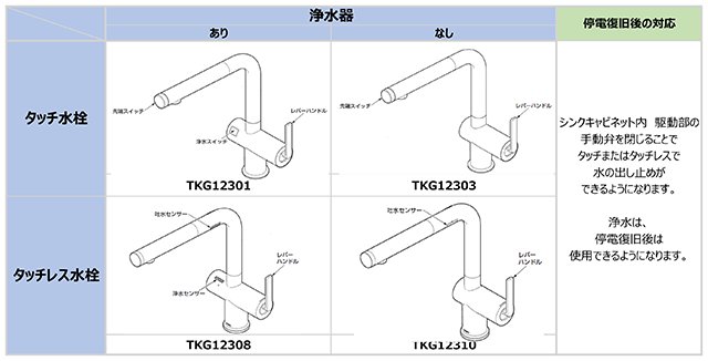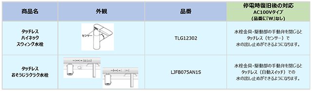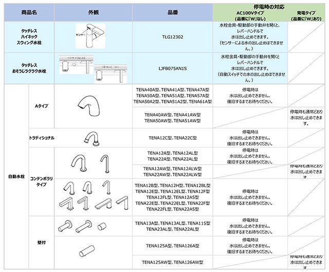 タッチレスハイネックスウィング水栓、タッチレスおそうじラクラク水栓(下記表の水色部分)は停電復旧後、手動弁を閉じることで、タッチレスで水の出し止めができるようになります。