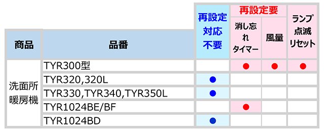 | 洗面所暖房機 | 【使用不可】 暖房、涼風、ドライヤー 【リモコンでの設定】 再設定要あり | ー | 再設定要あり |