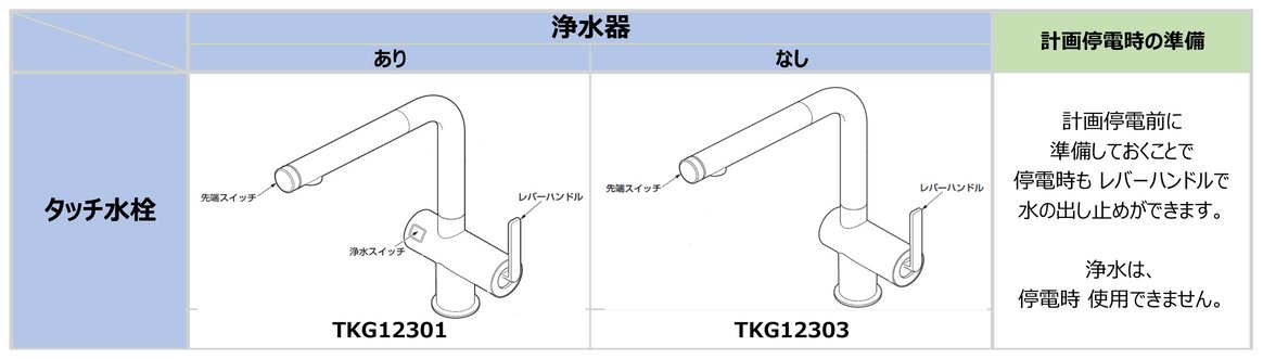タッチ水栓(下記表)は、計画停電など、事前に停電時期がわかっている場合、下記対応をすることで、レバーで水の出し止めができます。