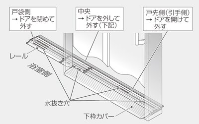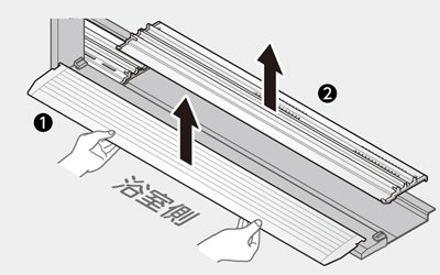 ドアを片側に寄せると、開けた側のレールが取り外せます。