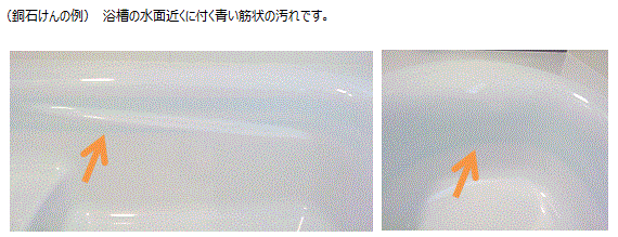 浴槽の水面近くに付く青い筋状の汚れは銅石けんの可能性があります。