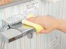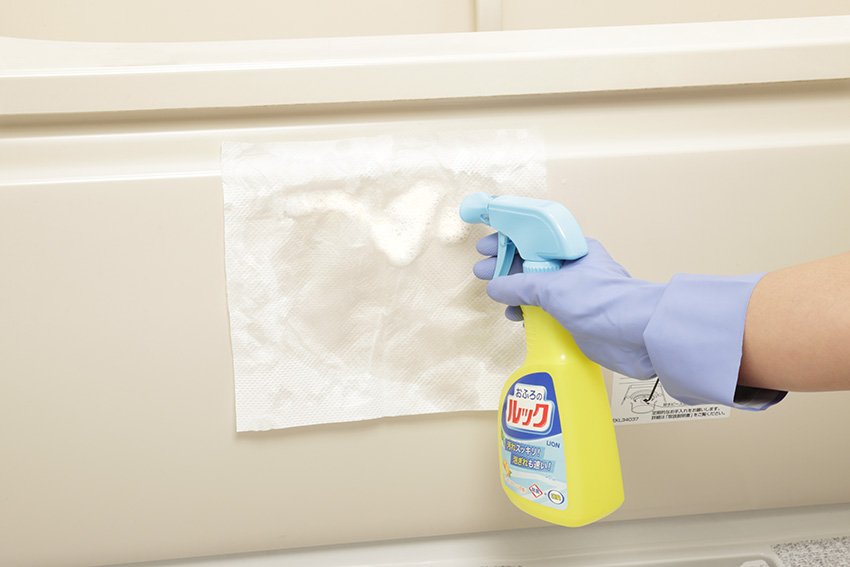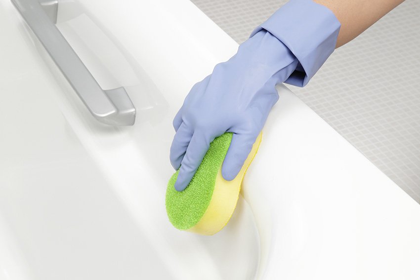2. 蓄積して固まったときは、浴室用クリームクレンザーを柔らかいスポンジに付け、こすり落とします。