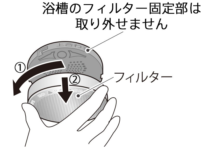 ① フィルターと浴槽のフィルター固定部の『▲マーク』を合わせて差し込む。