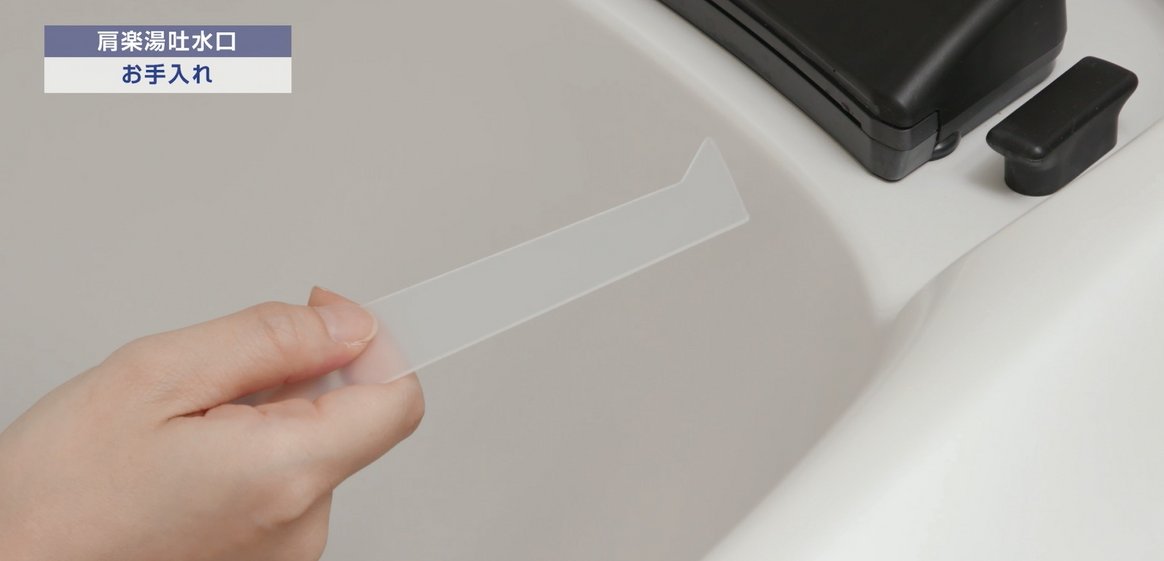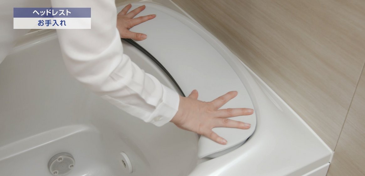 2. 浴室用中性洗剤をつけた柔らかいスポンジで、浴槽側のヘッドレスト取り付け部を洗う。