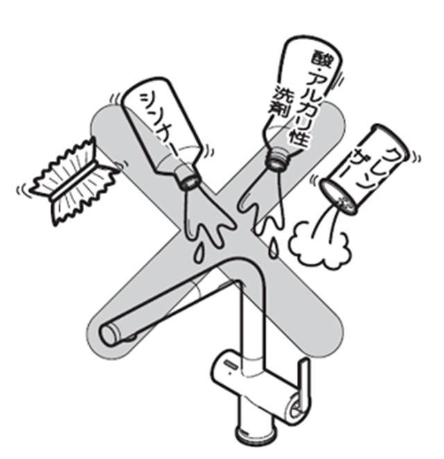 水栓の表面が変色したり、樹脂製部品が破損するおそれがあります。