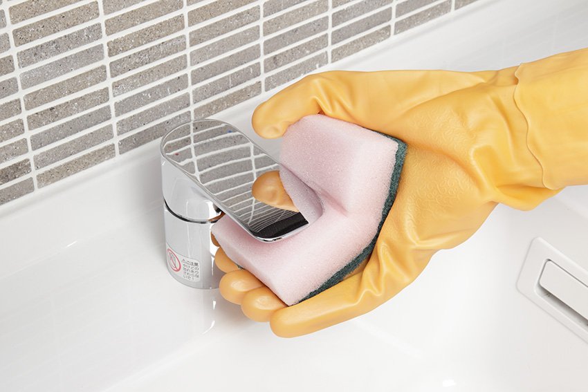 1. TOTOきらりあ水栓金具用蛇口まわりのクリーナーをスポンジにつけ、水栓全体を磨きます。