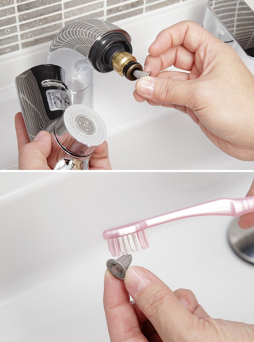 2. 網目に詰まったゴミを歯ブラシでこすって落とします。