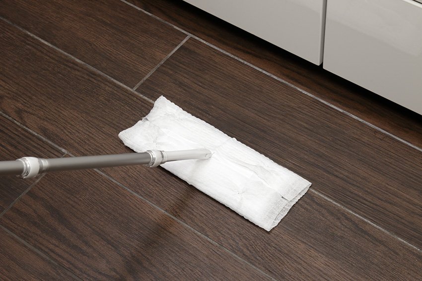 1. 住宅用弱アルカリ性洗剤を水で薄めた液にひたし、固く絞った布をペーパーモップに巻きつけ、床全体を拭きます。