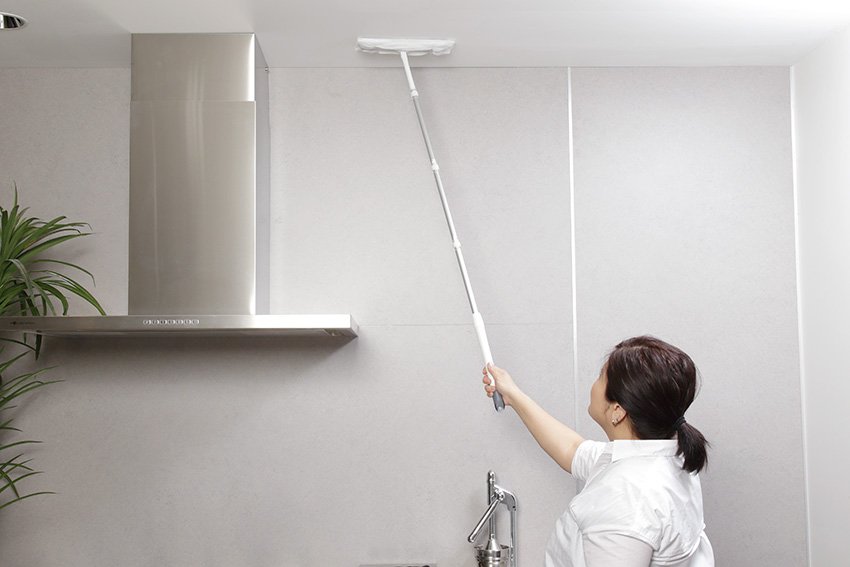 1. 住宅用弱アルカリ性洗剤を水で薄めた液にひたし、固く絞った布をペーパーモップに巻きつけて拭きます。しずくの液が落下しないよう、固く絞るのがコツです。