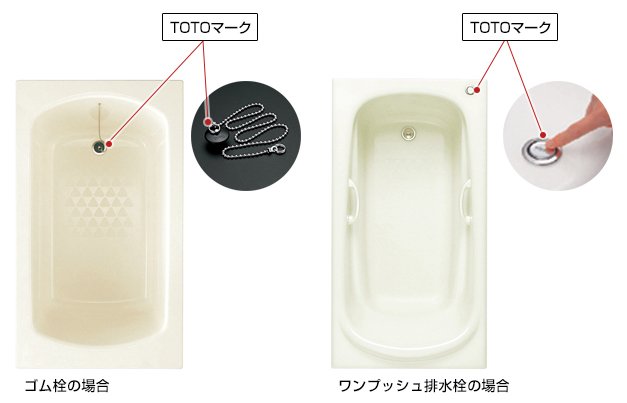 TOTOマークはゴム栓の場合はゴム栓部、ワンプッシュ排水栓の場合は、押しボタン部に表示しています。