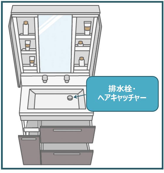 洗面化粧台の製品品番、または排水栓・ヘアキャッチャーの外観形状や寸法から部品品番が確認できます。