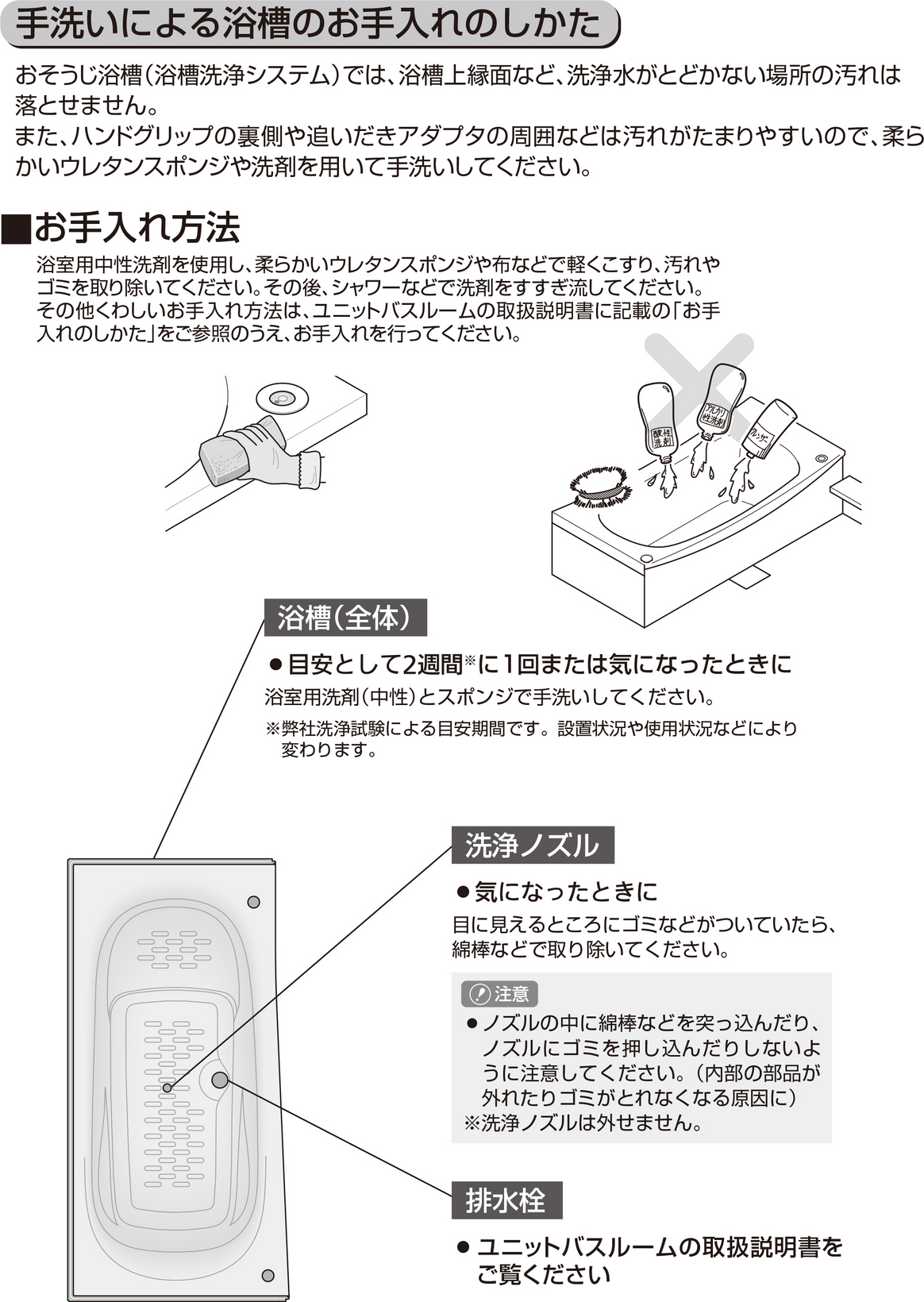 浴槽のふち・側面(エプロン)や、洗浄液の届きにくいハンドグリップの上面や内側は、手洗いしてください。