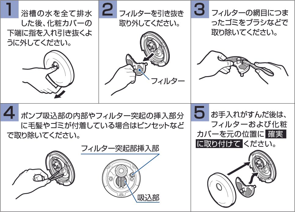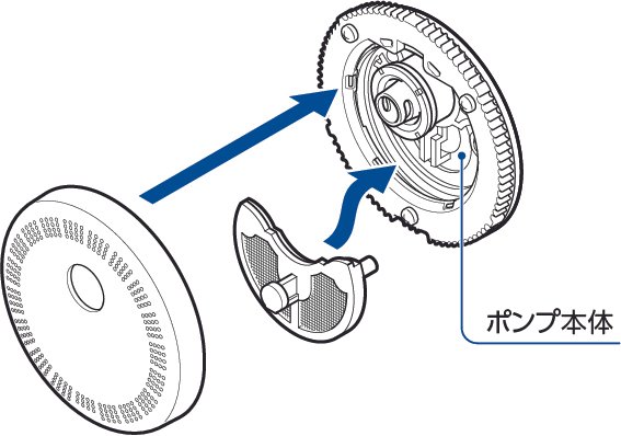 ご使用中、フィルターに毛髪・湯アカなどがつまると、ブローの勢いが弱くなり、十分な機能が発揮されなくなります。また、ポンプ故障の原因になります。