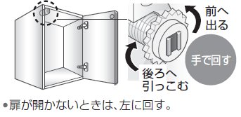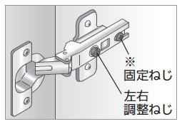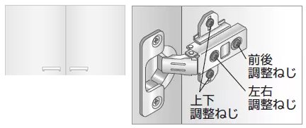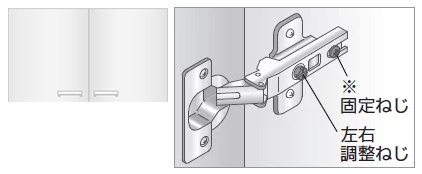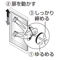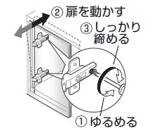 扉のタイプにより調整の仕方が違います。ご確認の上、扉の調整をお願いします。なお、扉の調整後は、ねじをしっかり締めてください。扉にずれはないが、がたつきがある時は、固定ねじがしっかり締まっているか確認ください。