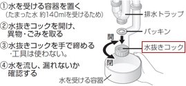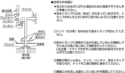 2.取扱説明書をご参照のうえ、排水トラップを取り外して配管の清掃をします。