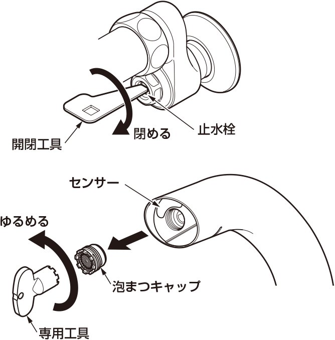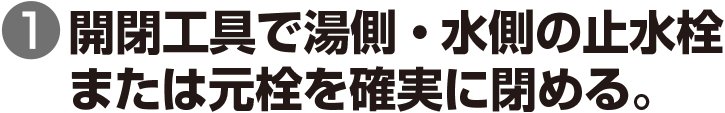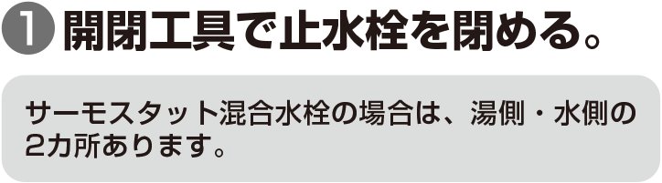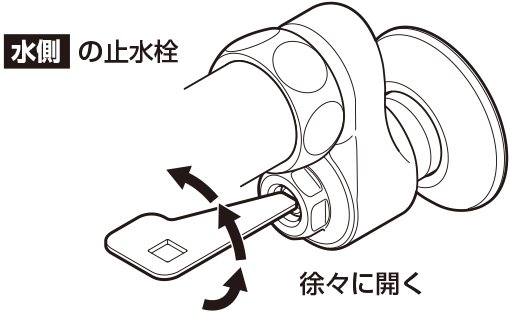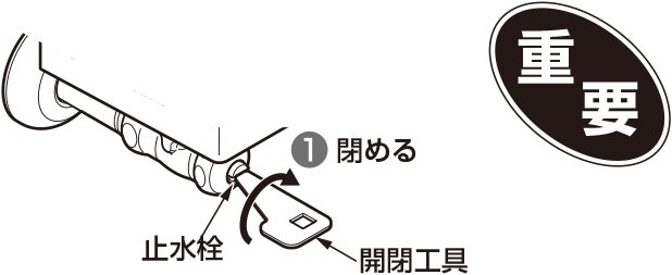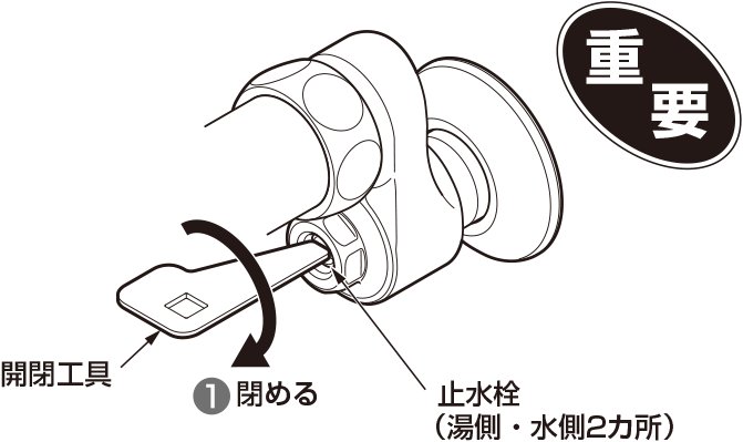 【重要】 使用期間が長い場合(約10年以上)は止水栓内部の金属が腐食している可能性がありますので、元栓を閉めてから作業を開始してください。 水が止まらなかったり、水漏れにより家財などを濡らす財産損害発生のおそれがあります。 |