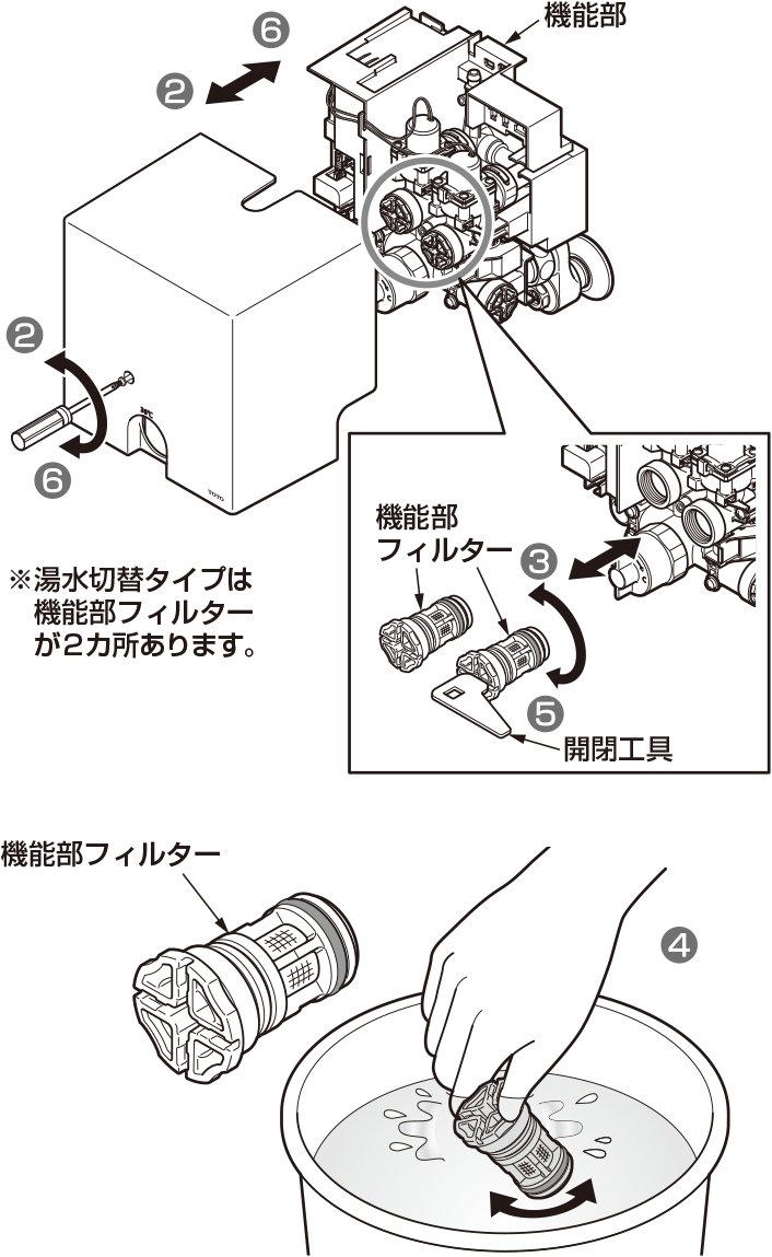<例:機能部フィルターの掃除方法(サーモスタット混合水栓の場合)>