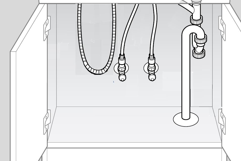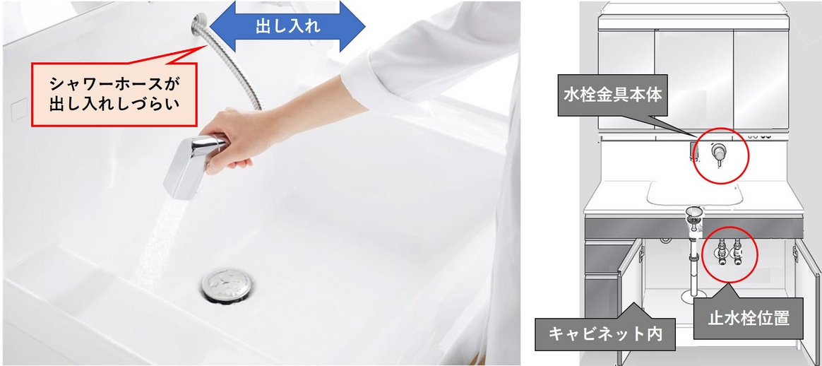キャビネット内に取り付けている、止水栓や配管などに、 シャワーホースが干渉している。