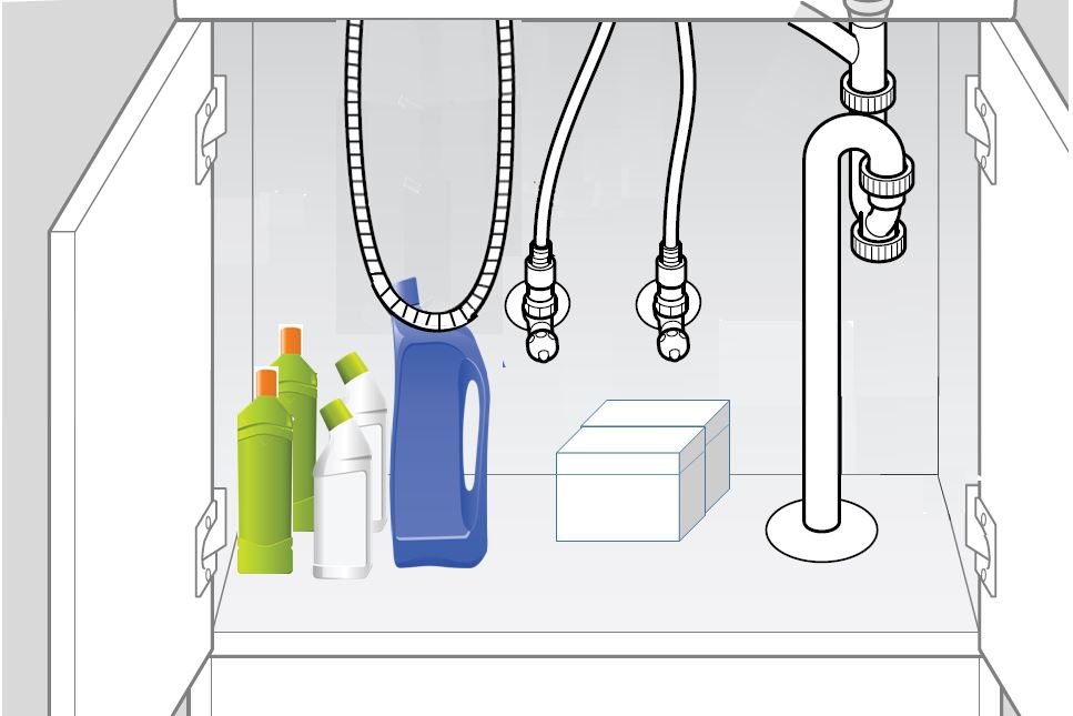 キャビネット内に保管している収納物(洗剤など)に、 シャワーホースが干渉している。
