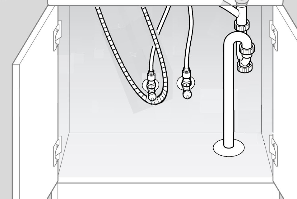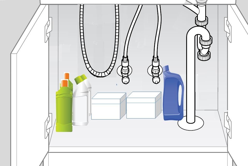 キャビネット(収納庫)内の収納物または止水栓への干渉が考えられます。