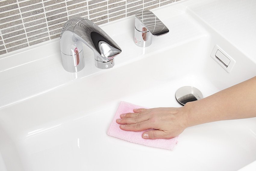 お客さまが使うことも多い洗面化粧台はいつもキレイにしておきたいものです。 そのためには、使ってすぐのおそうじが大切。