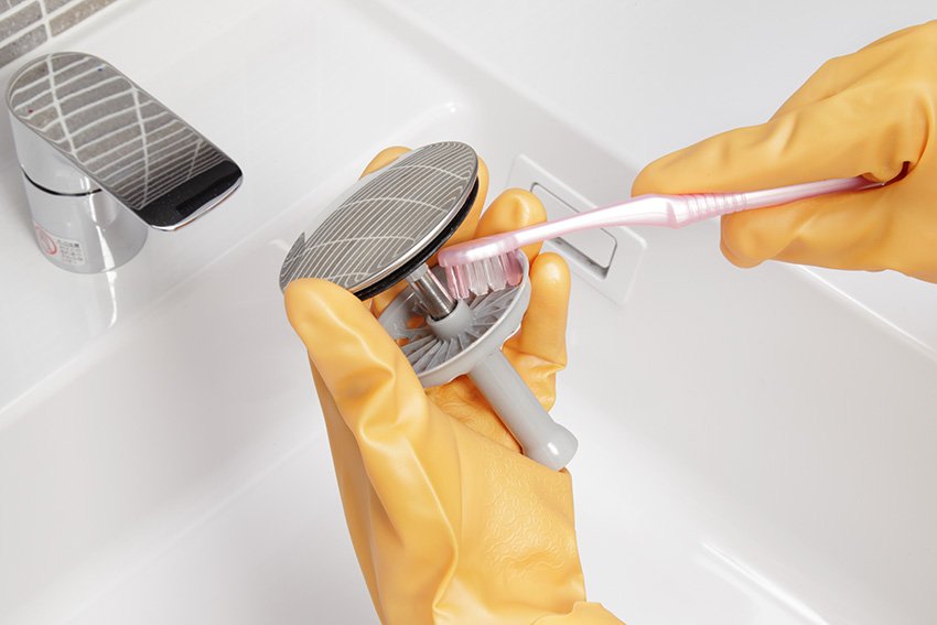 2. ヘアキャッチャーにたまったゴミを取り、歯ブラシで汚れをこすり洗いします。