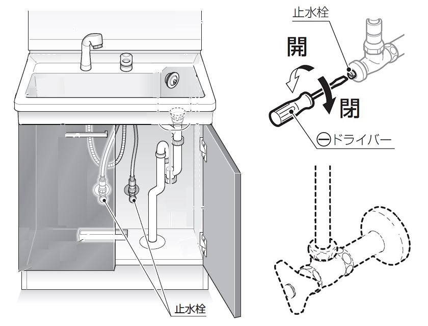 止水栓を調節することで、水の出る量を多く(少なく)できます。手順に沿って作業を実施してください。