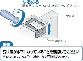 キャッチ機構(耐震ラッチ)のロックを解除し、受け座を調整してください。