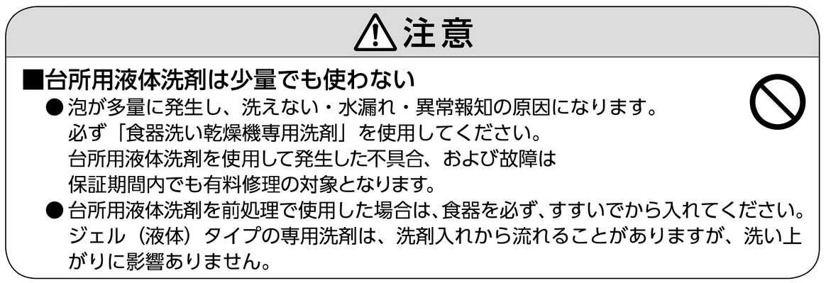(食器洗い乾燥機専用洗剤を使用せず、誤って台所用液体洗剤を入れてしまった。前処理で台所用液体洗剤を使用し、洗剤をよくすすがなかった場合も含む)