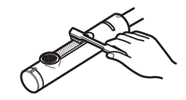 1. 同梱の筒状(黒)の吐水口開閉工具をキャップの溝に差し込み、矢印の方向も回して外します。