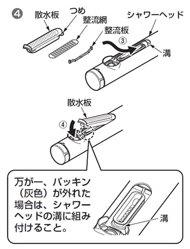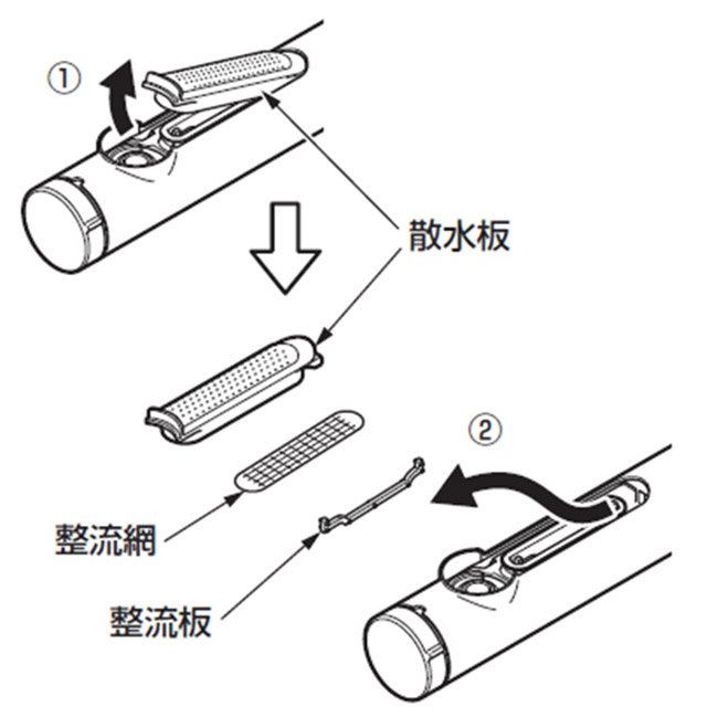 ・整流網、整流板の組み付け忘れや組み付け不良は、シャワーが乱れる原因となります。