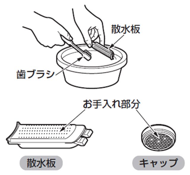 3. キャップ、散水板に詰まったごみあ汚れを清潔な歯ブラシなどで取り除いてください。