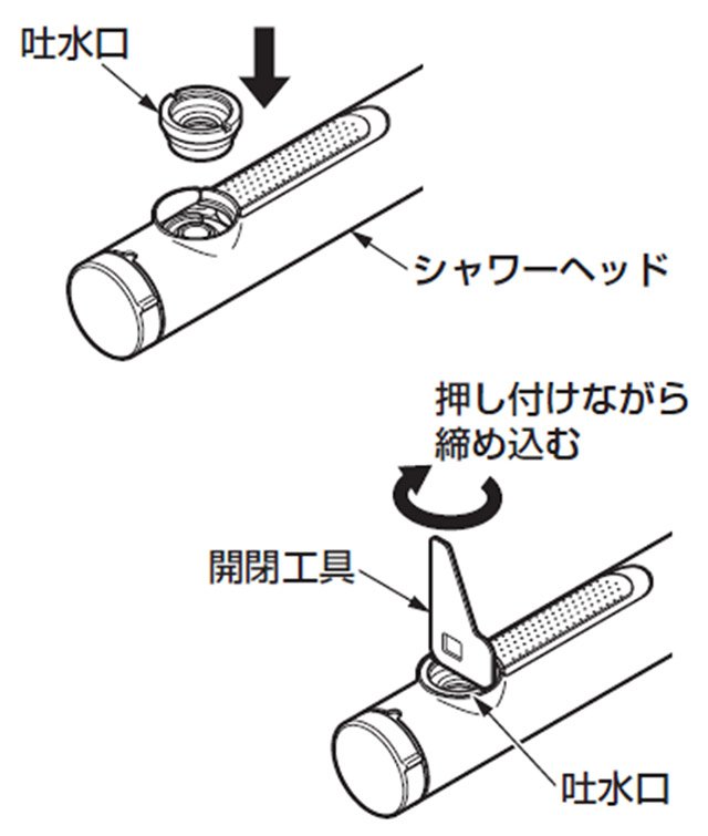 吐水口をシャワーヘッドに押し込み、ねじのかかりを確認して、板状の開閉工具(またはバターナイフなどの平板形状の物)で押し付けながら締め込みます。