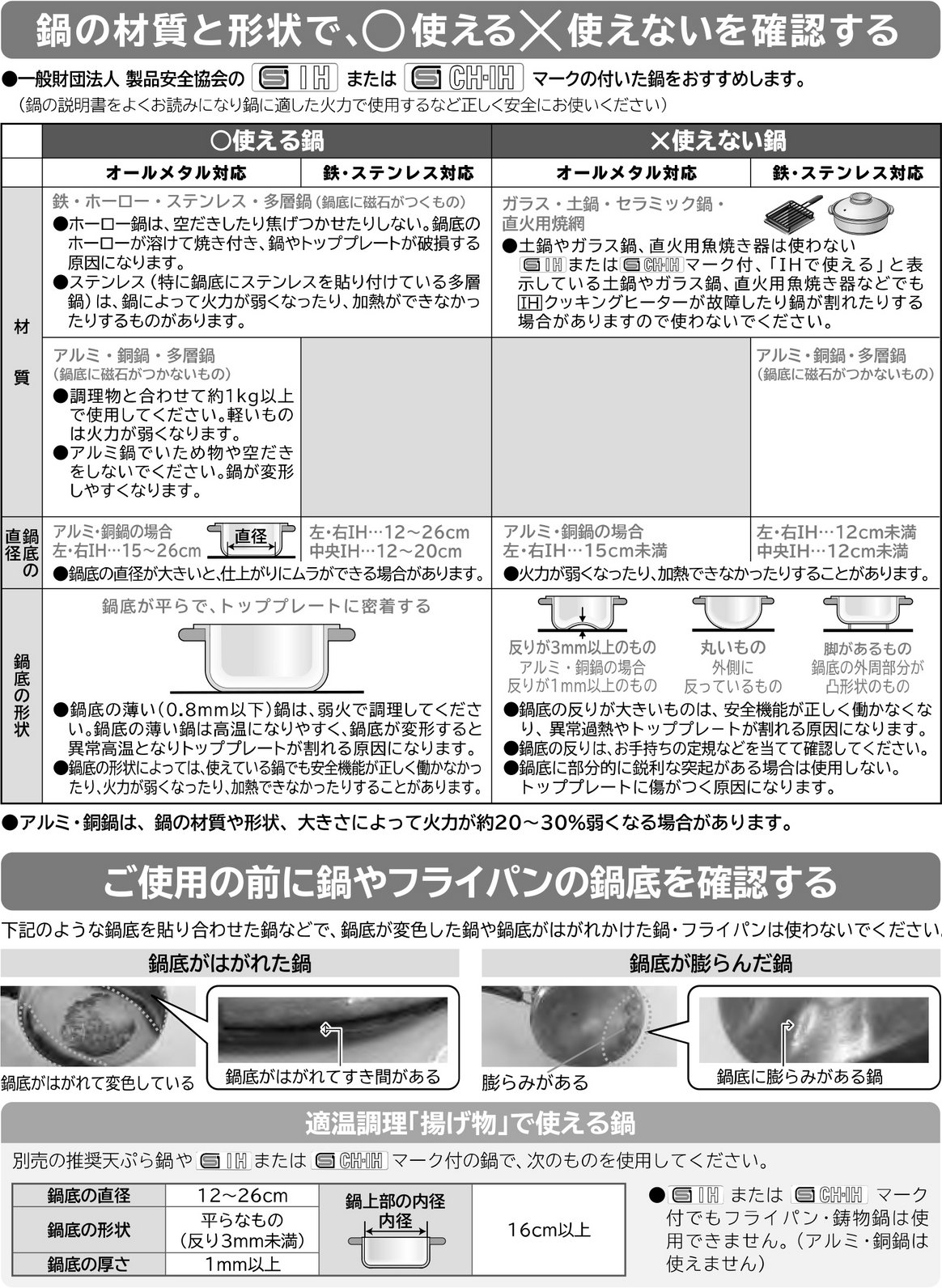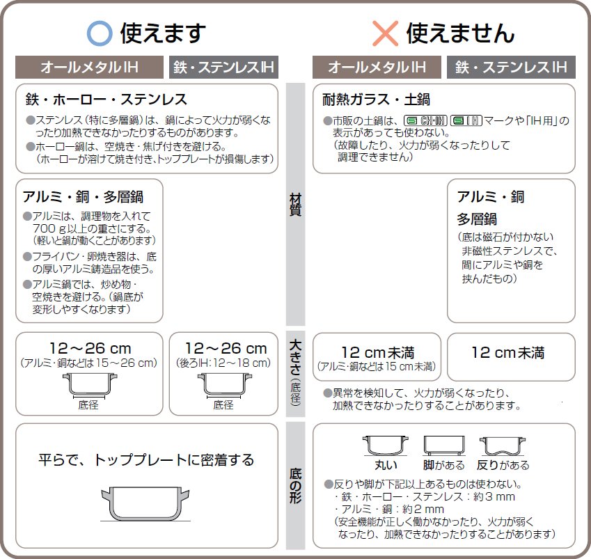 IHヒーターでは、鍋の材質や鍋底の直径や形状で、使える鍋と使えない鍋があります。