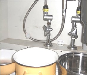 キャビネット内に保管している収納物(鍋や洗剤など)に、シャワーホースやストッパーが、干渉している。