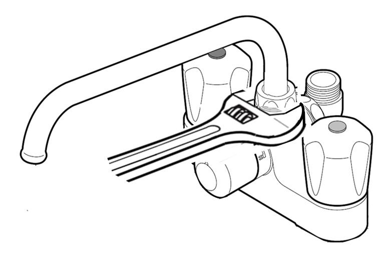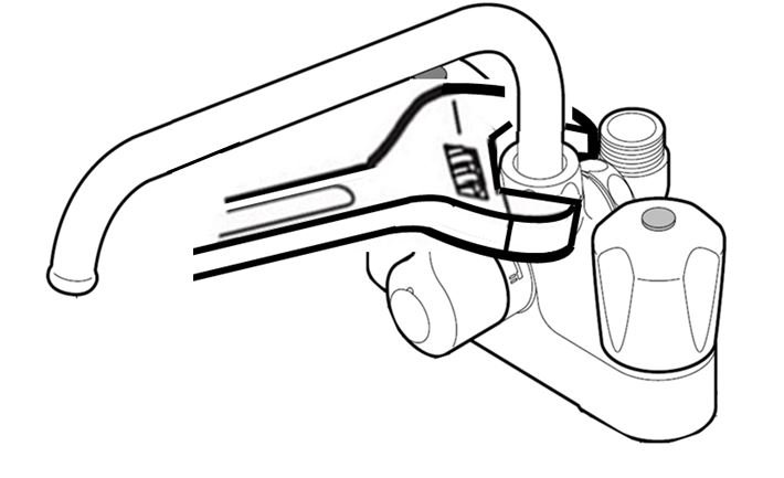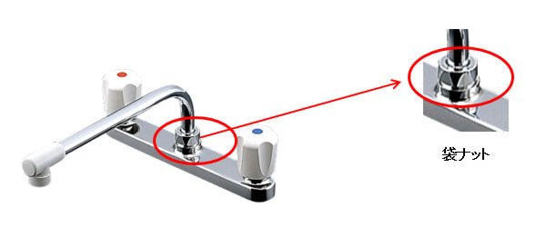 1. モンキーレンチを使って、袋ナットを 右(反時計回り)にまわして、袋ナットを緩め、スパウトを外してください。