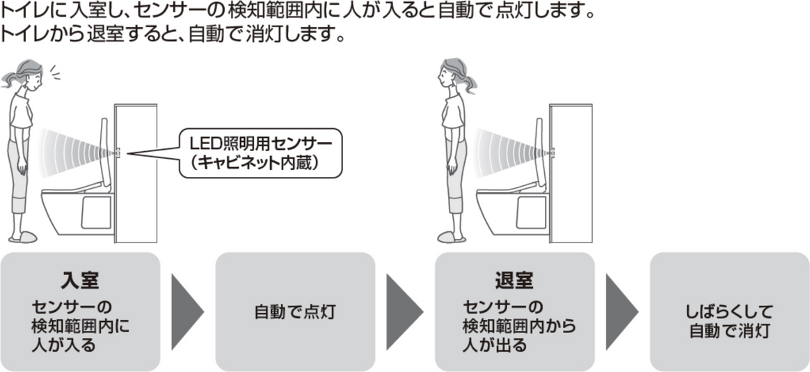 照明用センサーは便器正面側のトイレのドアや壁を透過して人の動きを検知するため、トイレの外にいてもLED照明が点灯する場合があります。