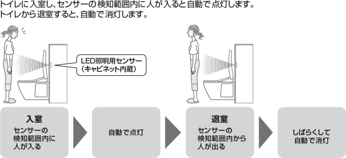 トイレに入室し、センサーの検知範囲内に人が入ると自動で点灯します。