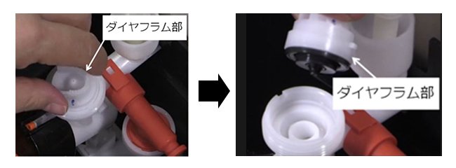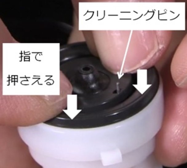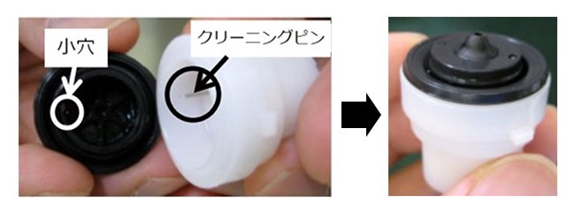 1.新しいダイヤフラム部を取出し、右図のように指で押さえてクリーニングピンが穴から出てくることを確認する。