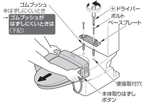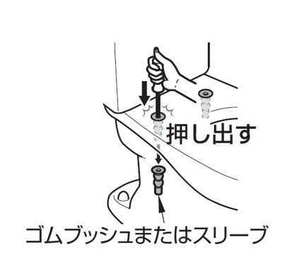 ※ゴムブッシュがはずれにくいときは、ボルト、座金、ベースプレートを取り除いた後に、+ドライバーで上から押さえて、下からはずしてください
