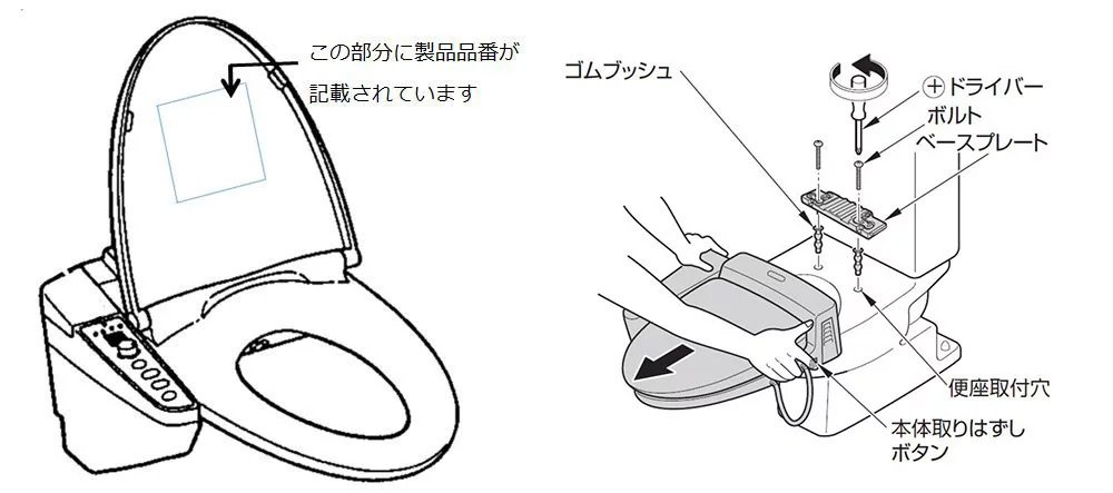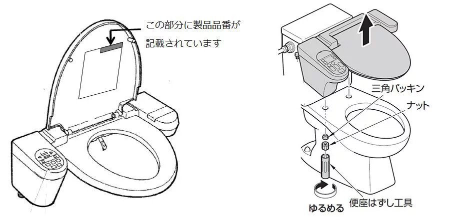 お使いのウォシュレットの製品品番を確認してください。(製品品番は、便ふたのラベルに記載しています。)