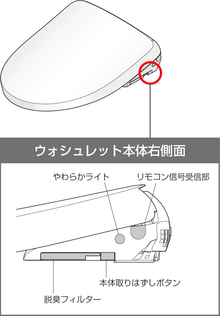 ウォシュレット本体正面から見て右側に「本体取りはずしボタン」が付いていればワンタッチ着脱タイプのウォシュレットです。