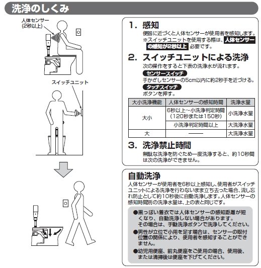 発電タイプの場合は、オートクリーンCの人体センサーの感知が2秒以上必要です。便座に座り、人体センサーを2秒以上感知させた後、スイッチユニットを操作してください。