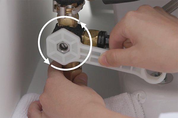 ハンドルの六角部はバネで動くようになっていますので、ハンドルを止水栓に押しつけながら反時計まわりに回してください。