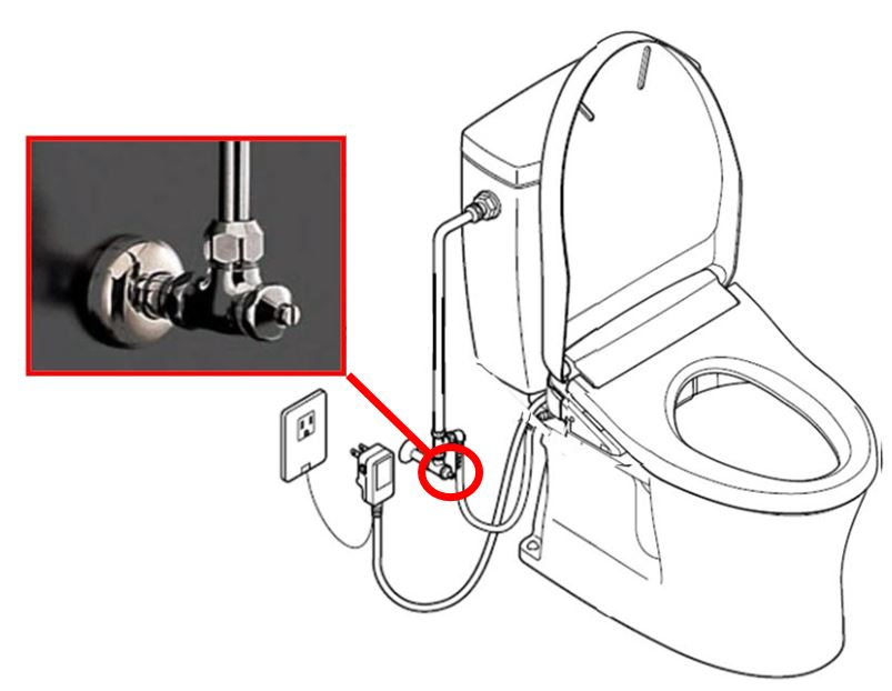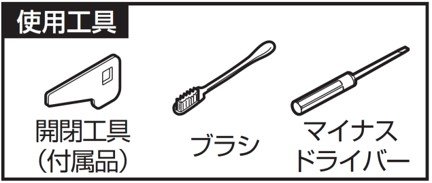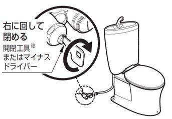 1. 開閉工具で止水栓を右(時計まわり)にまわして閉め、水を止めます。タンクの水を流します。
