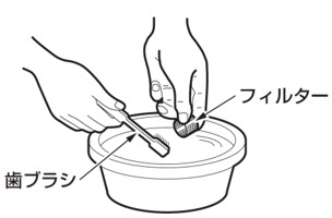 1. フィルターに詰まったごみを、歯ブラシで取り除いてください。